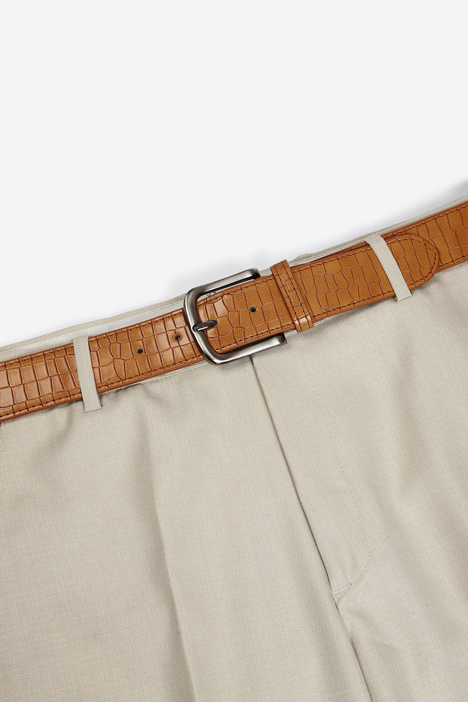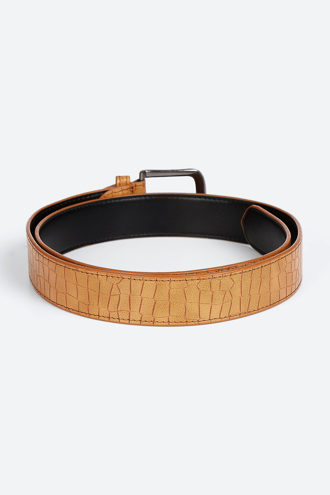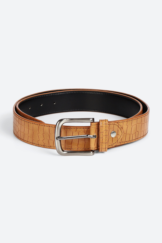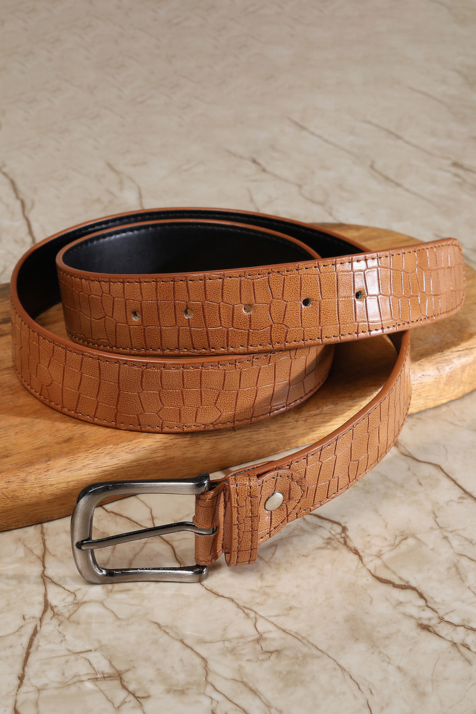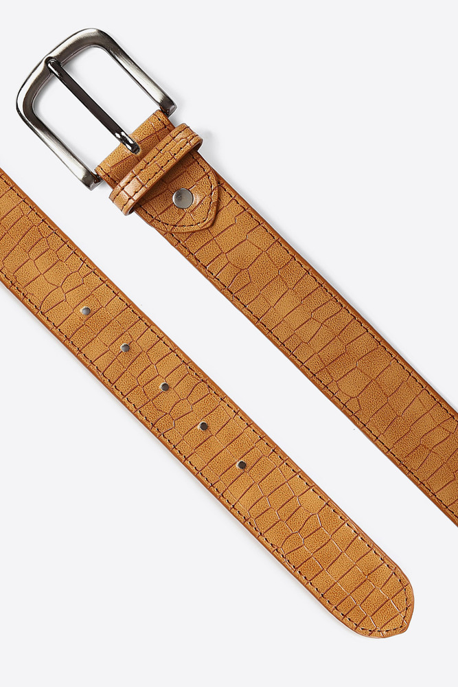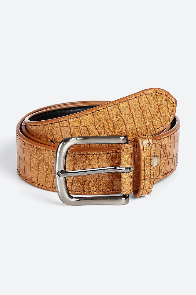 Add a touch of bold sophistication to your outfit with this Tan Textured Belt. Featuring a crocodile inspired texture and a sleek silver tone buckle, this belt blends rugged charm with modern flair. Perfect for pairing with denim, chinos, or casual trousers for a smart, polished look. Disclaimer - Please note that the color of the product shown on the website may differ slightly from the actual product due to factors such as lighting and screen display.